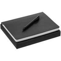 Недатированный ежедневник с гибкой обложкой из фактурного материала La Fite и металлическим шильдом на ляссе и ручка в тон, упакованные в подарочную коробку из дизайнерского картона.