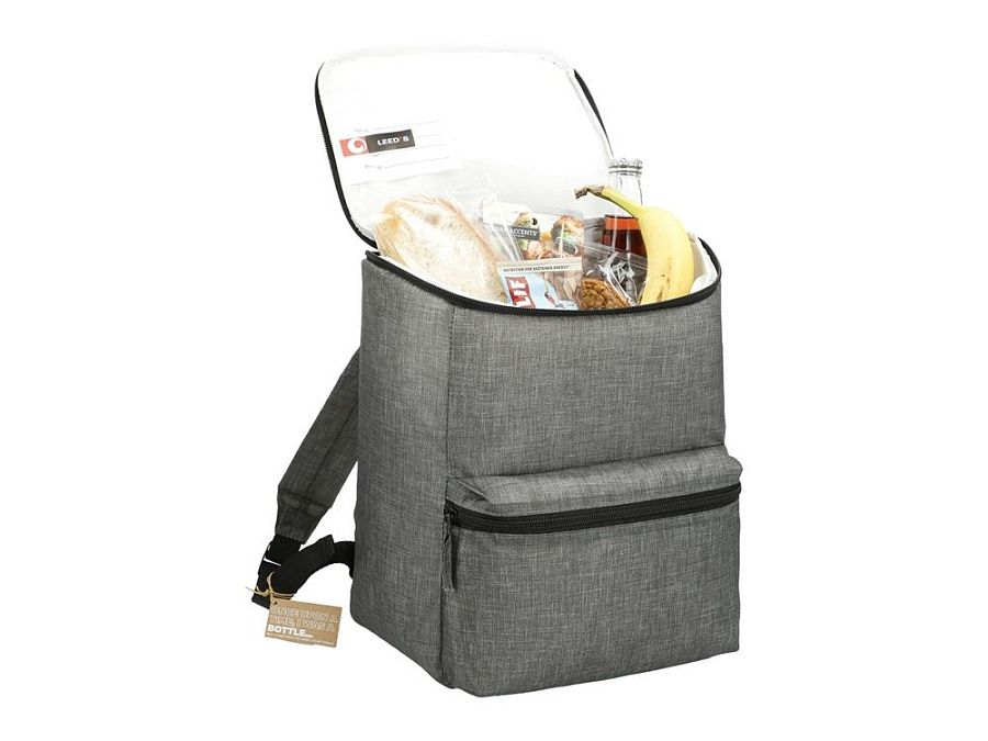 Рюкзак-холодильник из переработанного пластика вмещает 20 банок по 0,33 л. Спереди карман на молнии. Сбоку сетчатый карман. Лямки регулируются по длине.
