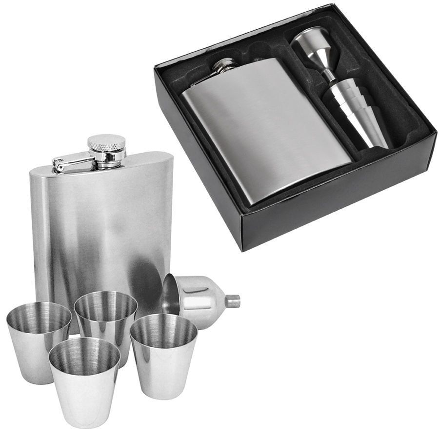 Размеры фляжки: 13,6 см х 9,4 см х 2,2 см. Объем 235 мл. Размеры стопок: высота 4,3 см, диаметр основания 2,5 см, диаметр верхней части 3,3 см. Размеры воронки: высота 4,6 см, диаметр верхней части 3,9 см.