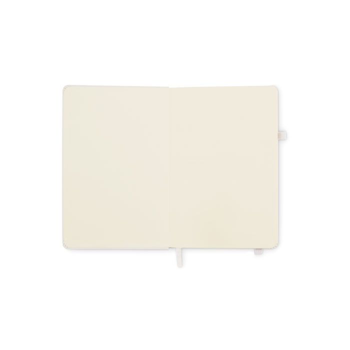 Блокнот формата A5 с обложкой из переработанного полиуретана. Переплет. 192 линованные страницы из переработанной бумаги (96 листов). Эластичный ремешок и крепление для маркеров и ручек.