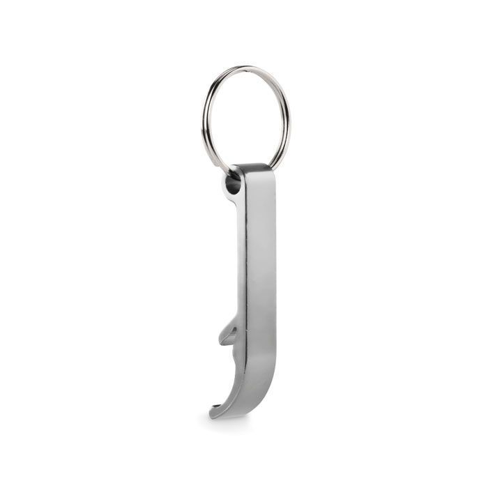Открывалка для бутылок и брелок для ключей из переработанного алюминия с блестящей отделкой.