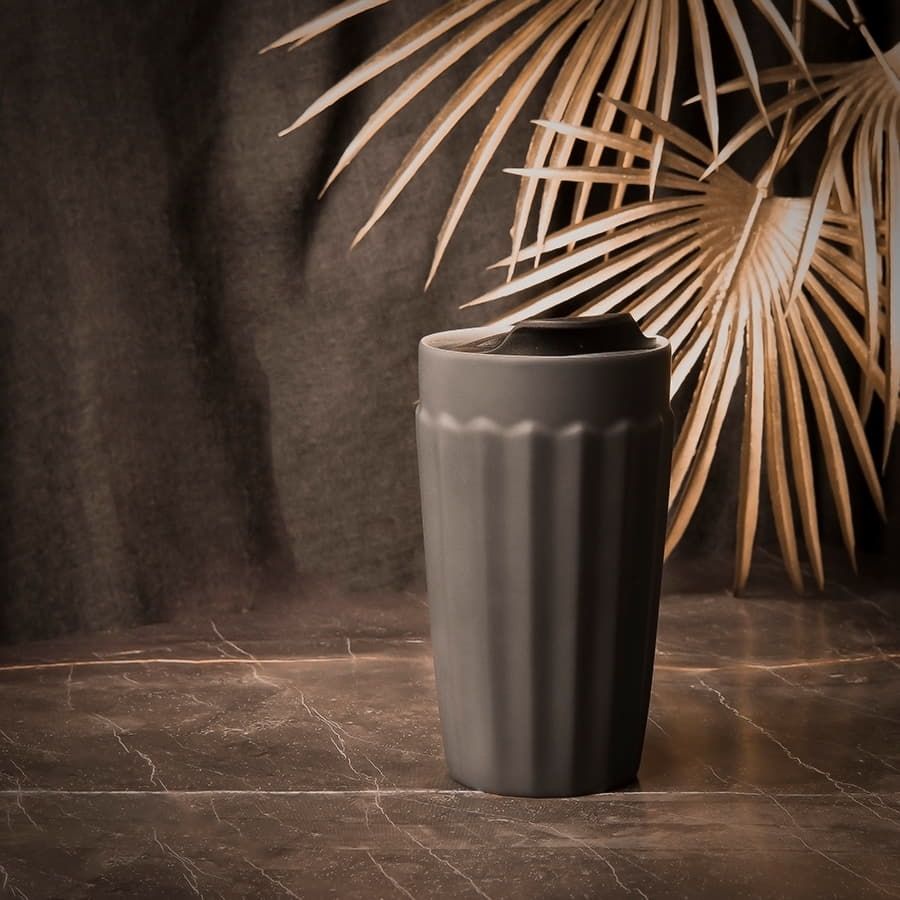 Керамический стакан с двойными стенками, имеет необычную форму с гранямиКорпус имеет прорезиненное покрытие, оно отлично подходит для лазерной гравировки: изображение получается ярким и выделяющимсяПластиковая крышка с силиконовым уплотнителем не даст вашему напитку быстро остыть, но рекомендуется использовать температуру напитков не выше 80СЦвет близкий к Pantone 433UПоскольку стакан имеет двойные стенки - на дне изделия находится технологическое отверстие, которое не является браком.Индивидуальная упаковка - коробка из крафтового картона