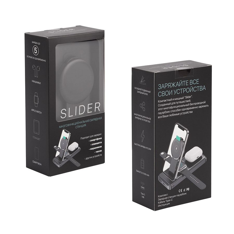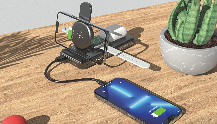 Уникальный гаджет, сочетающий в себе 2 устройства - беспроводную зарядную станцию 3 в 1 и пауэрбэнк ёмкостью 10 000 mAh с максимальными показателями мощности/скорости зарядки: беспроводным способом - до 15W, проводным (через кабель) - до 20W.