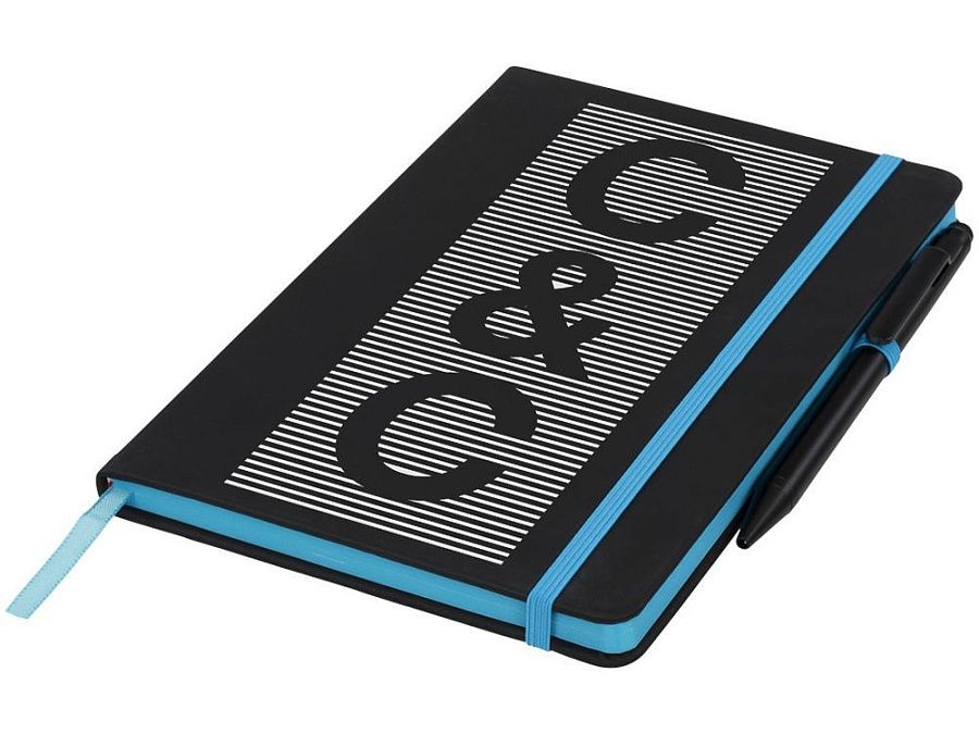 Блокнот Noir Edge среднего размера. Современный и стильный черный блокнот с мягкой на ощупь обложкой. Цветной край и цветные маркеры страниц, застежка-держатель для ручки. Предлагается с черной шариковой ручкой-стилусом. Блокнот содержит 96 листов линованной бумаги (70 г/м²) кремового цвета. ПУ.