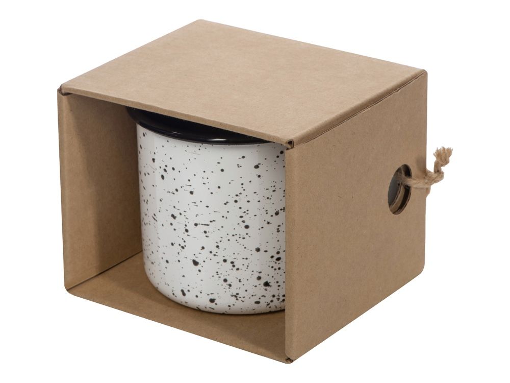 Эмалированная кружка поставляется в необычной упаковке — крафтовой коробке с открытой стенкой. Не беспокойтесь за комплектность — к упаковке кружка присоединена при помощи шпагата, продетого сквозь ручку и отверстия на углу коробки. Необычная подача создает первое впечатление от подарка, заставляя приглядеться к нему внимательнее.