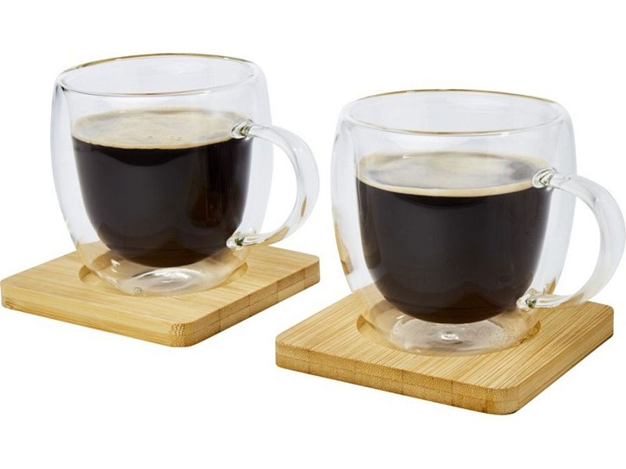 Набор из 2 термостаканов с двойными стенками и бамбуковой подставкой. Бамбук поставляется из устойчивых, экологически и социально ответственных источников. Благодаря двойному боросиликатному стеклу температура напитка сохраняется в течение длительного времени. Объем 100 мл. Размер подставки: 8 x 8 x 1 см.