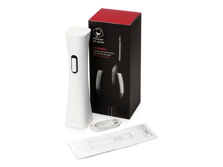 Потрясающе полезный и впечатляющий подарок ценителям вин - электрический штопор ""Turbo"". С ним всегда легко и просто! Всего 7 секунд и пару нажатий - и бутылка вина откупорена! В комплектации: штопор, нож для обрезания фольги, инструкция по использованию, USB кабель. • Штопор дополнен ножом, предназначенным для срезания фольги с горлышка винной бутылки; • пробка выкручивается с помощью нажатия всего одной кнопки; • скорость открывания – 7 секунд; • питание: литиевый аккумулятор; • уровень шума до 65 Дб; • диаметр пробки: 18-23 мм; • наружный диаметр бутылки не более 35 мм; • емкость аккумулятора 800M mAh; • продолжительность работы: до 60 бутылок на одной зарядке; • 8 часов для полной подзарядки штопора; • наличие индикатора уровня заряда. Нижняя и верхняя часть одной и той же кнопки отвечают за спуск и поднятие спирали, которая вытаскивает пробку из бутылки.