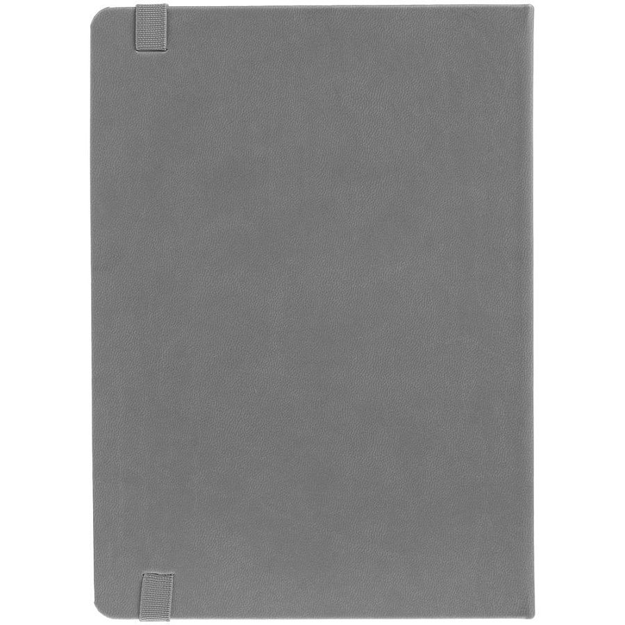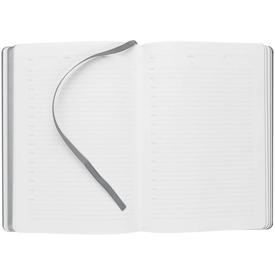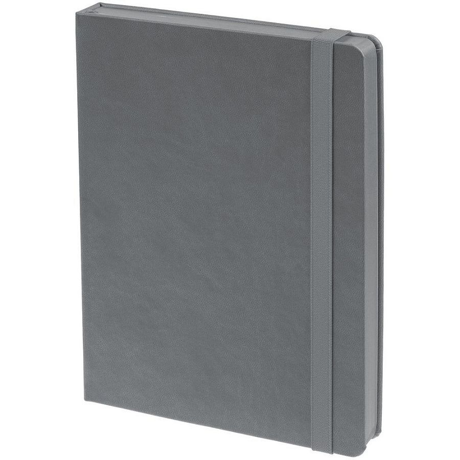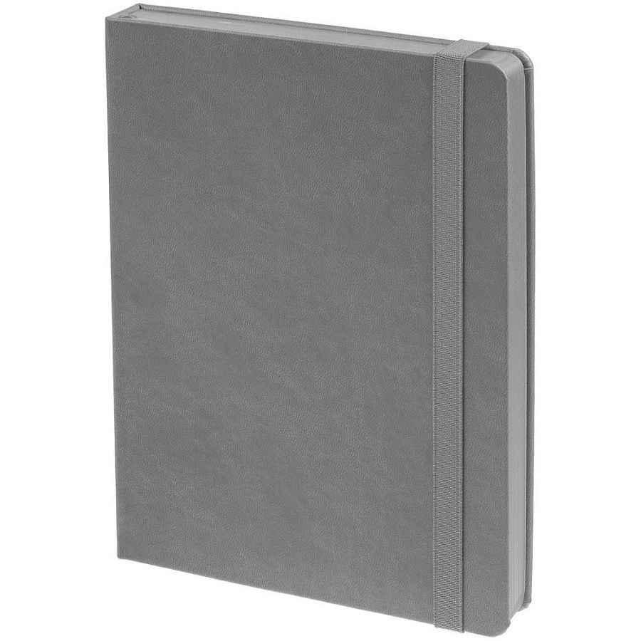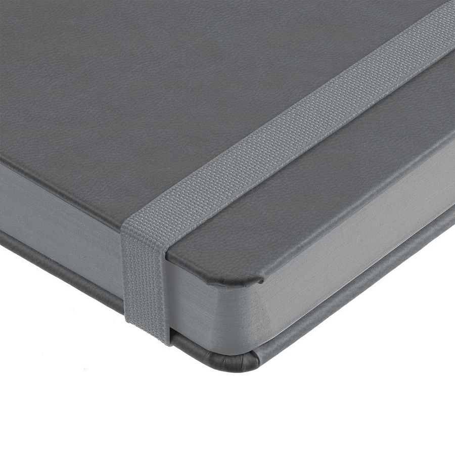 Ежедневник с твердой обложкой, выполнен из материала Latte, серый СС, обрез серого цвета, дополнен резинкой и ляссе серого цвета.