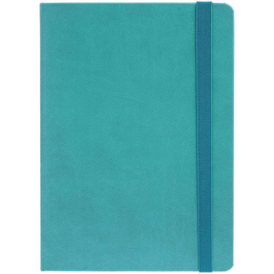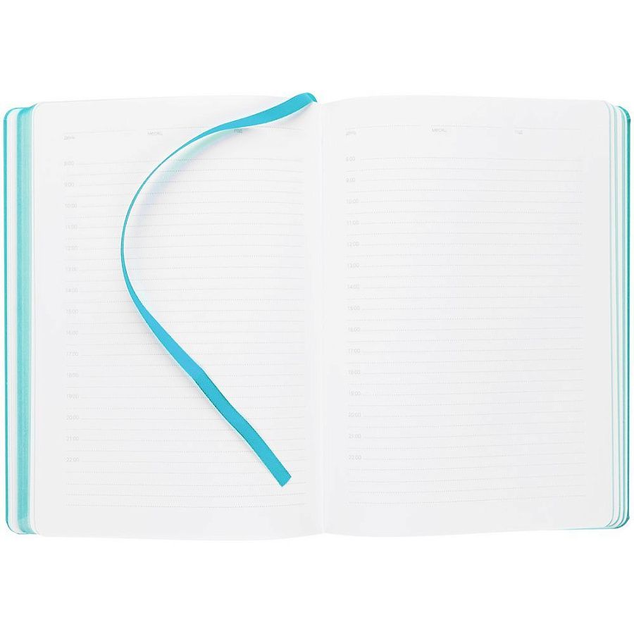 Ежедневник с твердой обложкой, выполнен из материала Latte, цвет морской волны II, обрез бирюзового цвета, дополнен резинкой и ляссе бирюзового цвета.