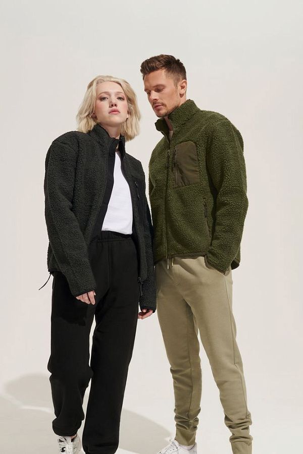 Куртка унисекс из фактурной искусственной шерпы с гладкой отделкой из таслана.