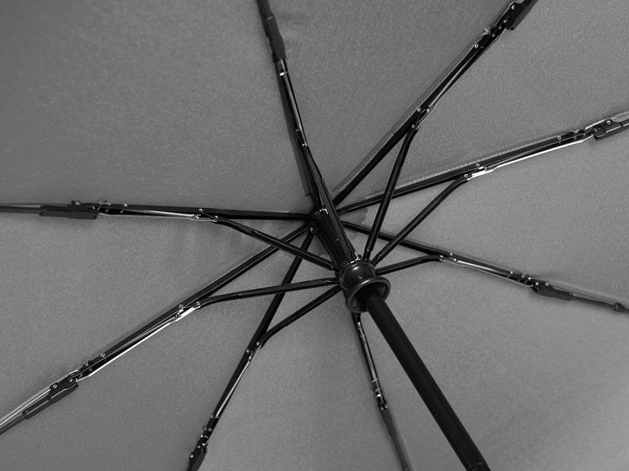 Купол зонта выполнен из переработанного пластика. Гибкие спицы из стекловолокна делают зонт стойким к порывам ветра. Удобная ручка софт тач. Фиксирующая купол застежка на липучке шириной 3 см - дополнительная опция для нанесения вашего логотипа.