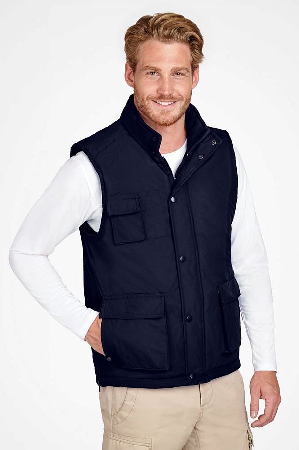 Жилет унисекс из ткани «рипстоп». Высокий воротник на кнопках, на подкладке из флиса. Расстегивается при помощи молнии и кнопок.