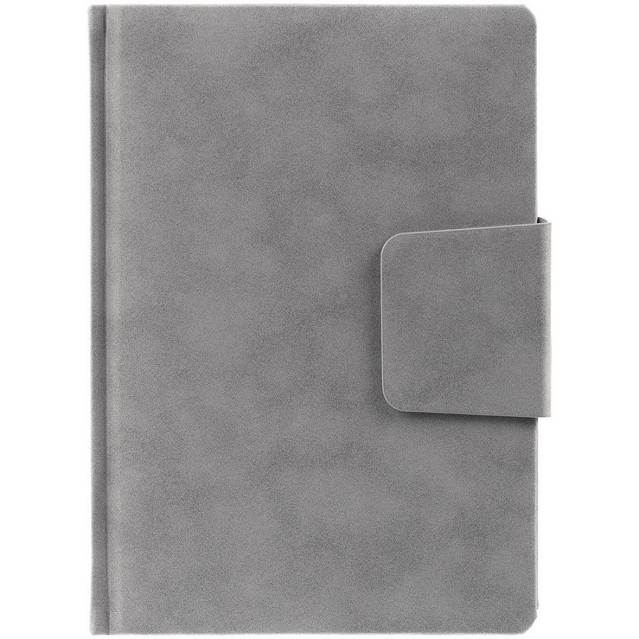Ежедневник с твердой обложкой c поролоном, выполнен из материала Nubuck, серый СС, дополнен капталом и ляссе серого цвета. Застежка — хлястик на магните.