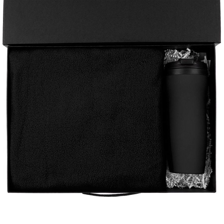 термостакан - пластик, крышка, внутренняя колба; нержавеющая сталь, корпус; покрытие софт-тач; плед - флис, плотность 180 г/м²; коробка - переплетный картон; наполнитель - бумага