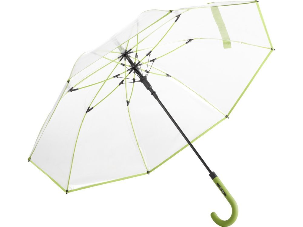 Зонт-трость с прозрачным куполом и контрастными деталями легко открывается нажатием кнопки на ручке. Каркас выполнен из прочной долговечной гальванизированной стали. Благодаря гибким спицам из стекловолокна зонту не страшны порывы ветра.