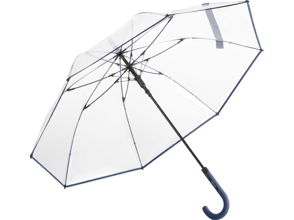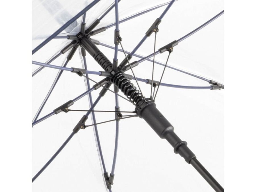 Зонт-трость с прозрачным куполом и контрастными деталями легко открывается нажатием кнопки на ручке. Каркас выполнен из прочной долговечной гальванизированной стали. Благодаря гибким спицам из стекловолокна зонту не страшны порывы ветра.