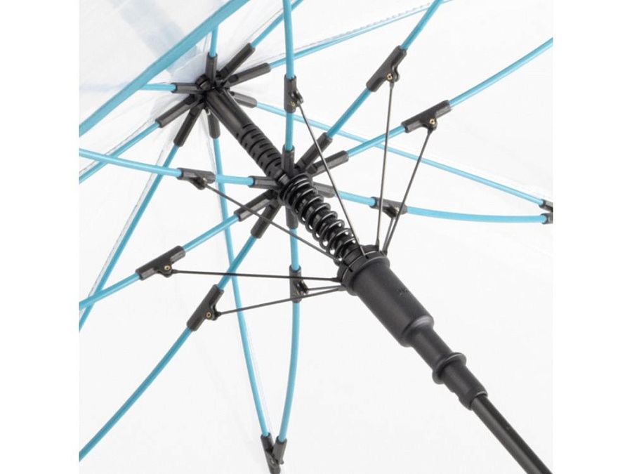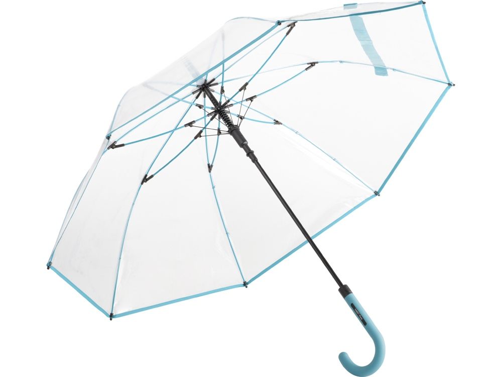 Зонт-трость с прозрачным куполом и контрастными деталями легко открывается нажатием кнопки на ручке. Каркас выполнен из прочной долговечной гальванизированной стали. Благодаря гибким спицам из стекловолокна зонту не страшны порывы ветра.