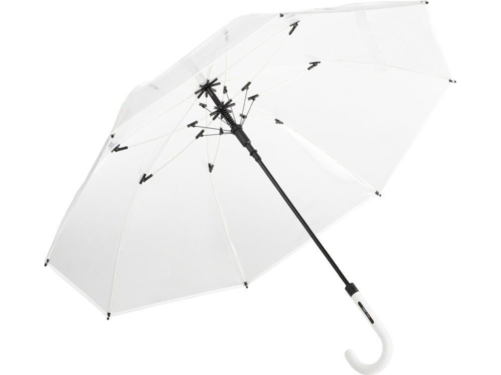 Зонт-трость с прозрачным куполом и контрастными деталями легко открывается нажатием кнопки на ручке. Каркас выполнен из прочной долговечной гальванизированной стали. Благодаря гибким спицам из стекловолокна зонту не страшны порывы ветра.