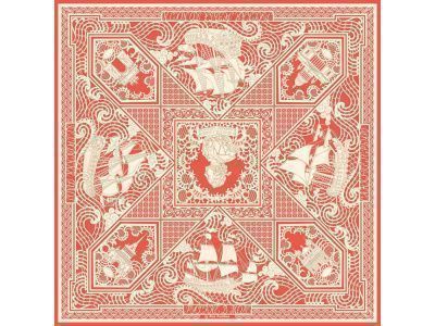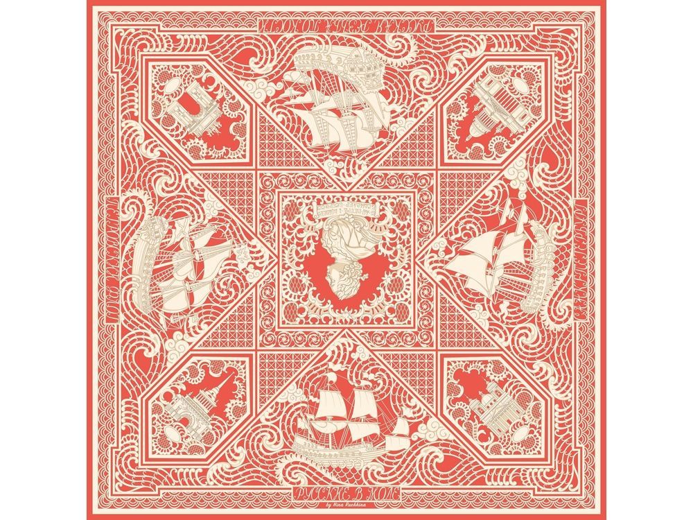 Тематика платка - Петровский Флот. В центре - декоративная резная пластина в пышном обрамлении с профилем великого русского самодержца Петра I.