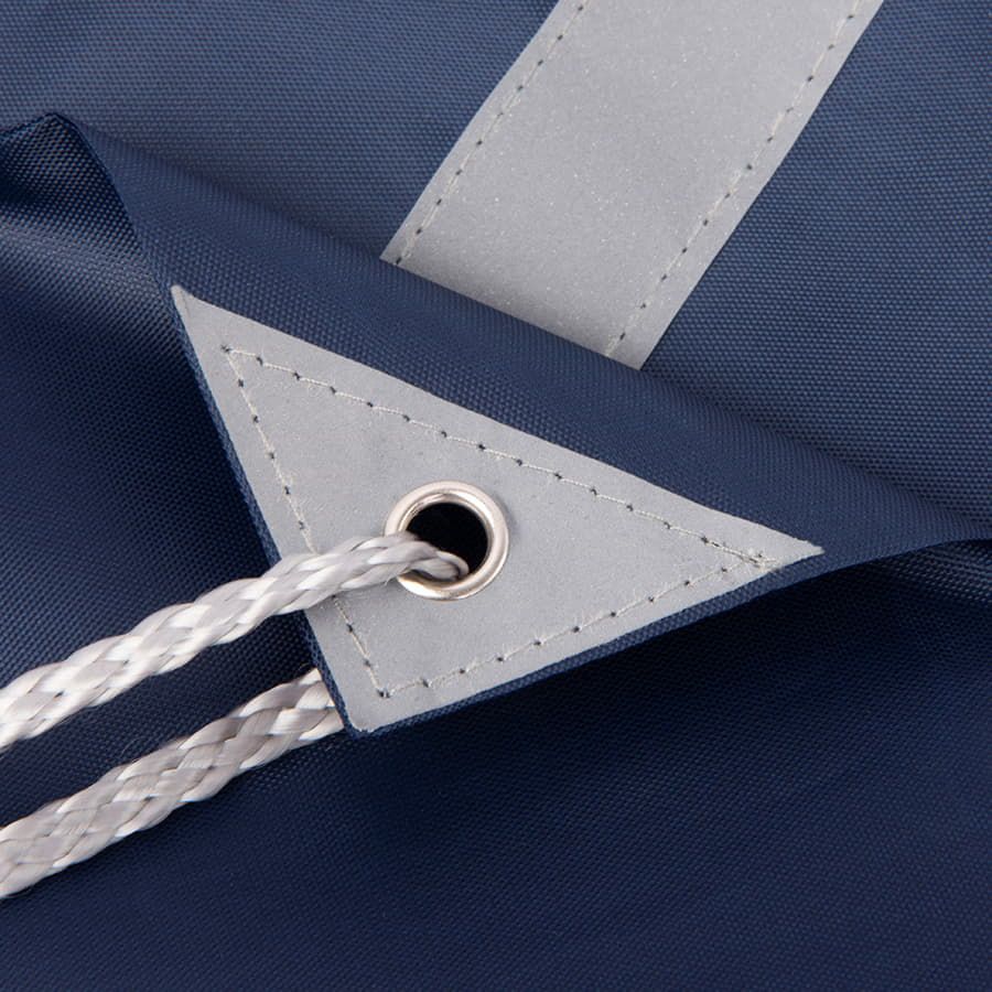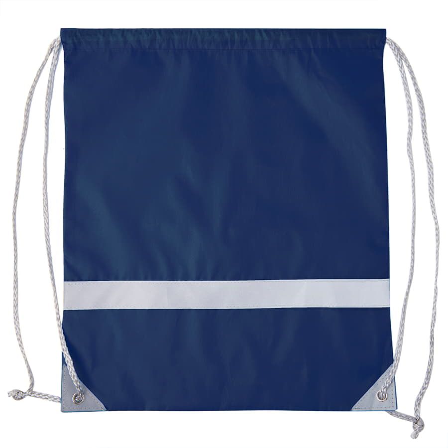 Просто и безопасно! Рюкзак-мешок RAY из полиэстера 210Dсо светоотражающей полосой спереди, светоотражающими уголками,усиленными металлическими люверсамиЛегко и просто затягивается по верхней части серыми шнурами.Тёмно-синий цвет близкий к Pantone 289C