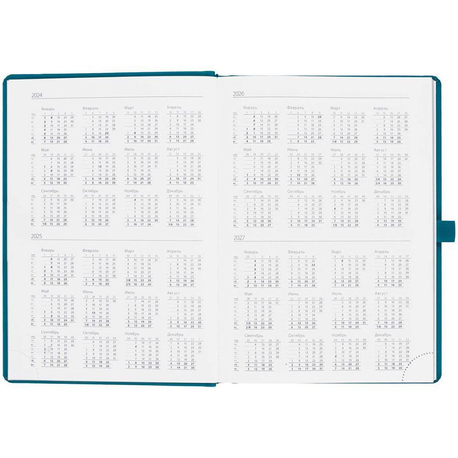 Ежедневник с твердой обложкой без поролона, выполнен из материала Soft Touch, цвет морской волны II, дополнен резинкой шириной 1 см, петлей-резинкой для ручки, капталом и ляссе темно-бирюзового цвета.