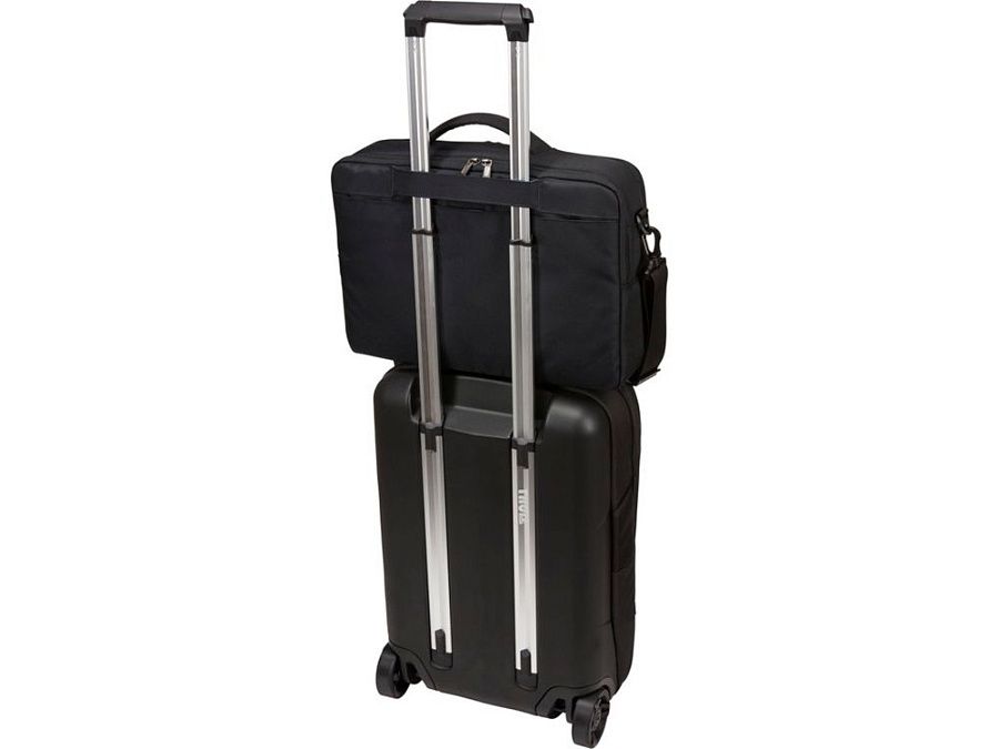 Сумка для ноутбука с главным отделением на молнии, мягким чехлом для ноутбука 15,6" и приспособленным для планшета 10" карманом. Поставляется со специальным внутренним отделением, в котором устройство можно держать отдельно от зарядных элементов, а также с мягким внутренним карманом для защиты телефона, солнцезащитных очков или других предметов и несколькими карманами во внутренней части, на передней и задней панелях. Имеет рукав для фиксации на выдвижной ручке дорожной сумки, заднюю панель с наполнением и съемный мягкий наплечный ремень. Водонепроницаемая.