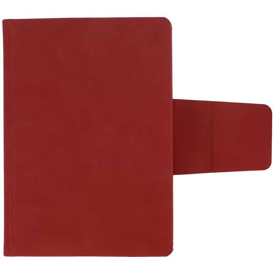 Ежедневник с твердой обложкой c поролоном, выполнен из материала Nubuck, красный РР, дополнен капталом и ляссе в цвет обложки. Застежка — хлястик на магните.