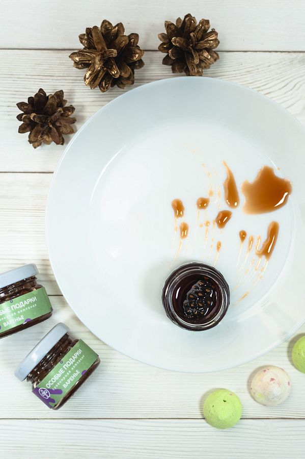 Нанесение (включено в стоимость): открытка на упаковку с вашим лого, манжет на варенье с вашим лого, манжет на чай с вашим лого.