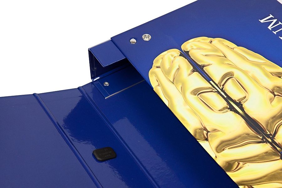 Брендированные портфели с пластиковой ручкой для переноски из кашированного переплётного картона на заказ с кнопками защелками.