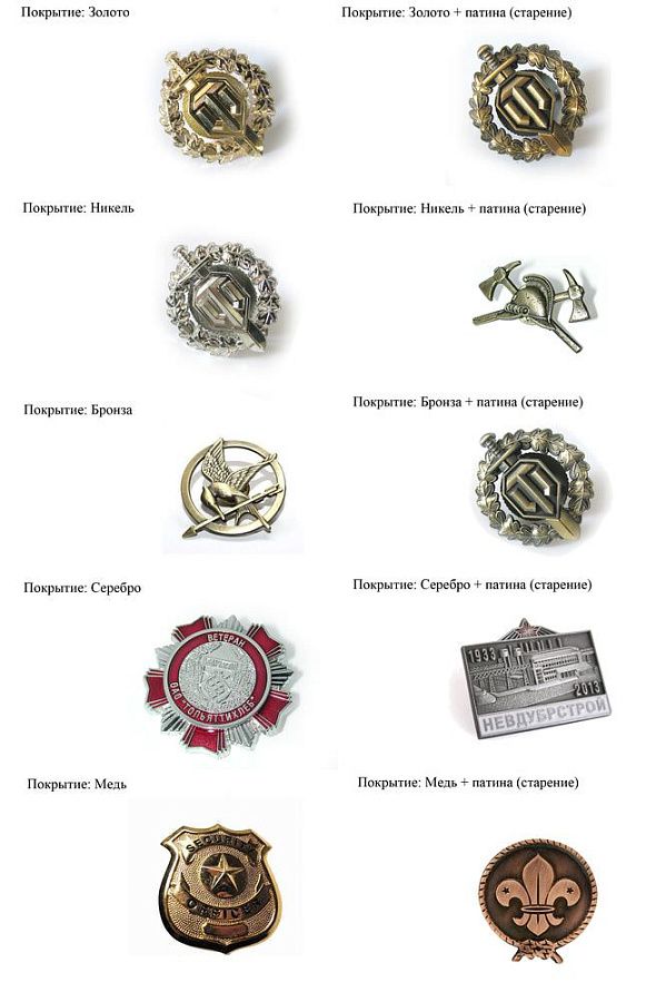 – цвет значка: золото / античное золото / серебро / античное серебро / медь / античная медь / бронза / античная бронза / никель / античный никель / комбинированные цвета;