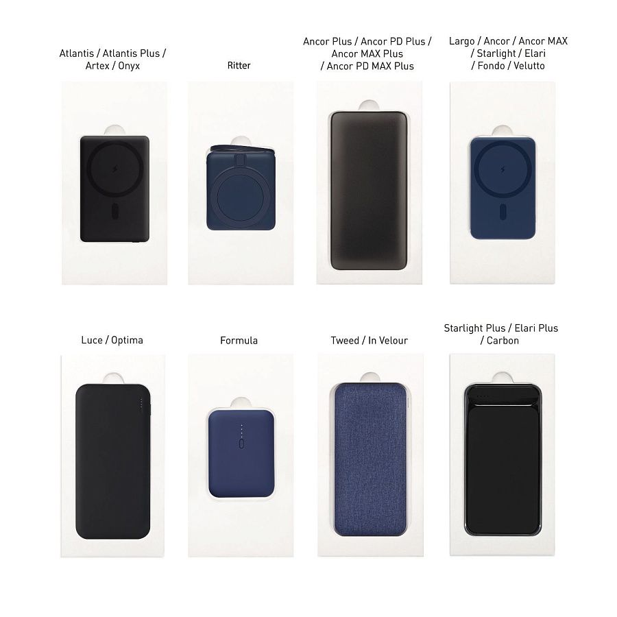 Доступны съемные ложементы для следующих моделей внешних аккумуляторов. (*Обращаем ваше внимание, что доп. ложементы под внешние аккумуляторы являются универсальными - они не фиксируют зарядное устройство, а являются ячейкой.):