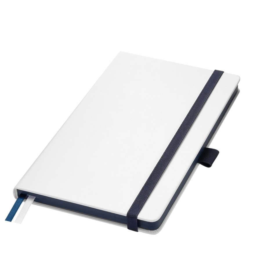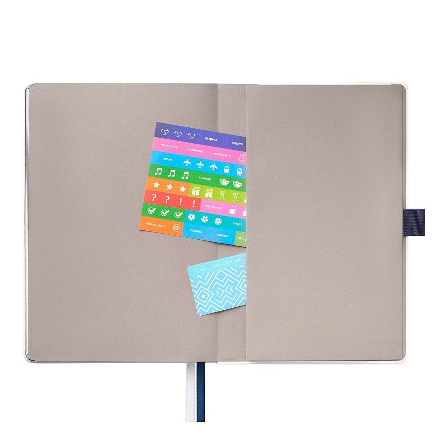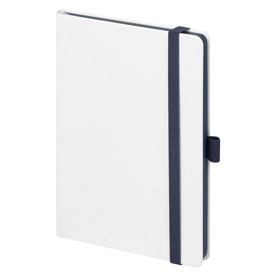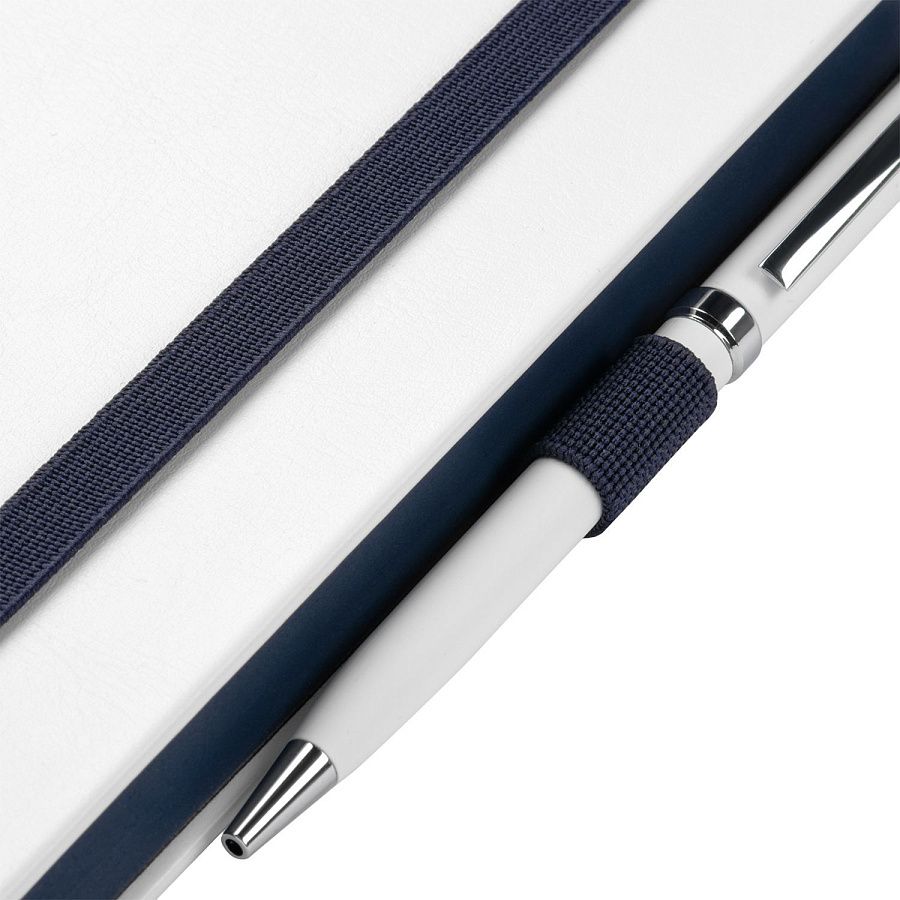Недатированный ежедневник выполнен в жесткой обложке из искусственной кожи со скругленными уголками. Переплетный материал гладкий, с легкой естественной паутинкой морщин, имеет полуглянцевый блеск. Цвет – чистый белый. Серые матовые форзац и нахзац, а также синий срез блока создают оригинальный динамичный цветовой ансамбль и подчеркивают белизну обложки. Страницы светло-кремового цвета, из гладкого офсета, слегка шелковистые, со скругленными уголками. Добавляют изделию мягкую комфортную теплоту. Двойное атласное ляссе составлено из синей и белой лент. Каждая шириной 6 мм, имеет легкий блеск. Вертикальная фиксирующая резинка прочная, надежная и удобная, в тон срезу. Есть петелька для ручки в тон резинки. Карман на заднем форзаце.