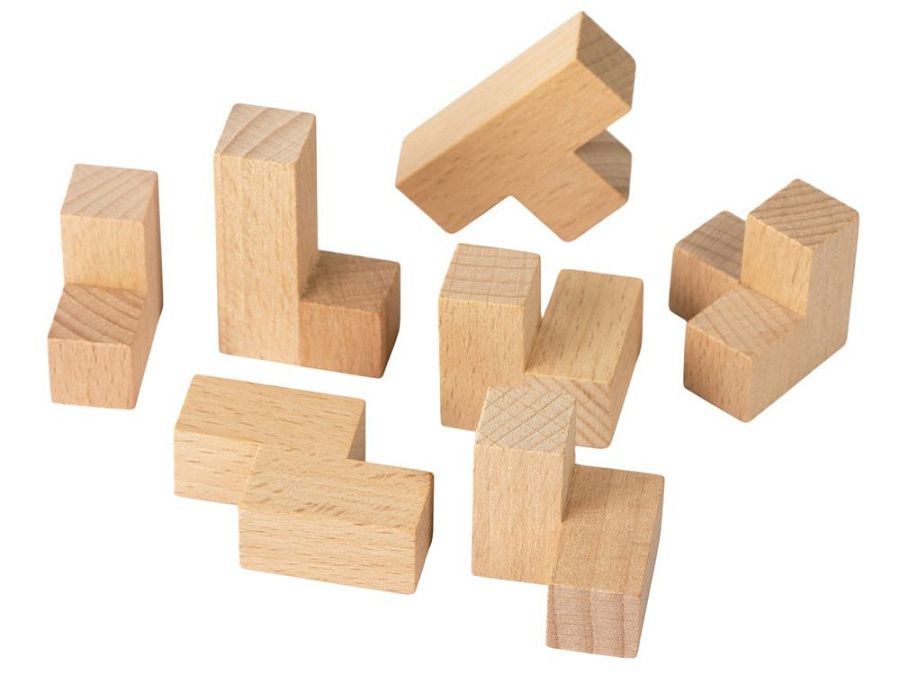 Состоит из семи деревянных деталей, поставляется в хлопковом мешочке на завязках. Кастомизация возможна, как на самих деталях, так и на мешочке.