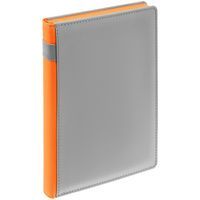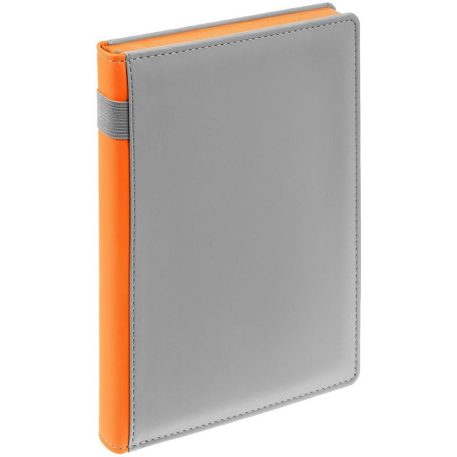 Твердая обложка с поролоном, материал обложки — Soft Touch, серый СС и Soft Touch, оранжевый ОО. На корешке ежедневника находится петля из резинки.