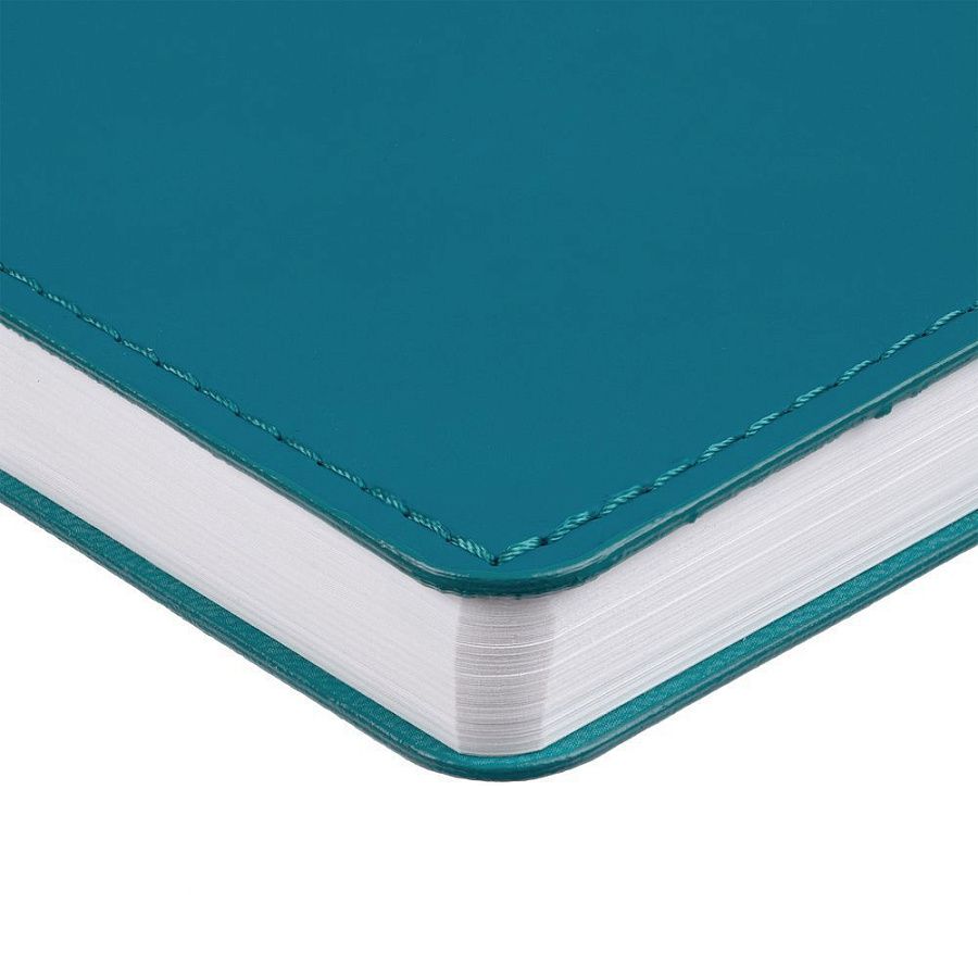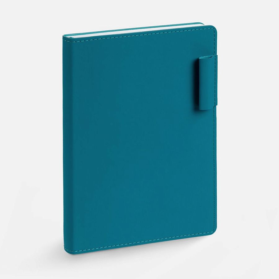 Ежедневник с гибкой обложкой из материала Soft Touch, цвет морской волны II и Latte, морская волна (внутренний материал), дополнен петелькой для ручки из покровного материала, капталом, ляссе и закрашенным срезом обложки в цвет материала.