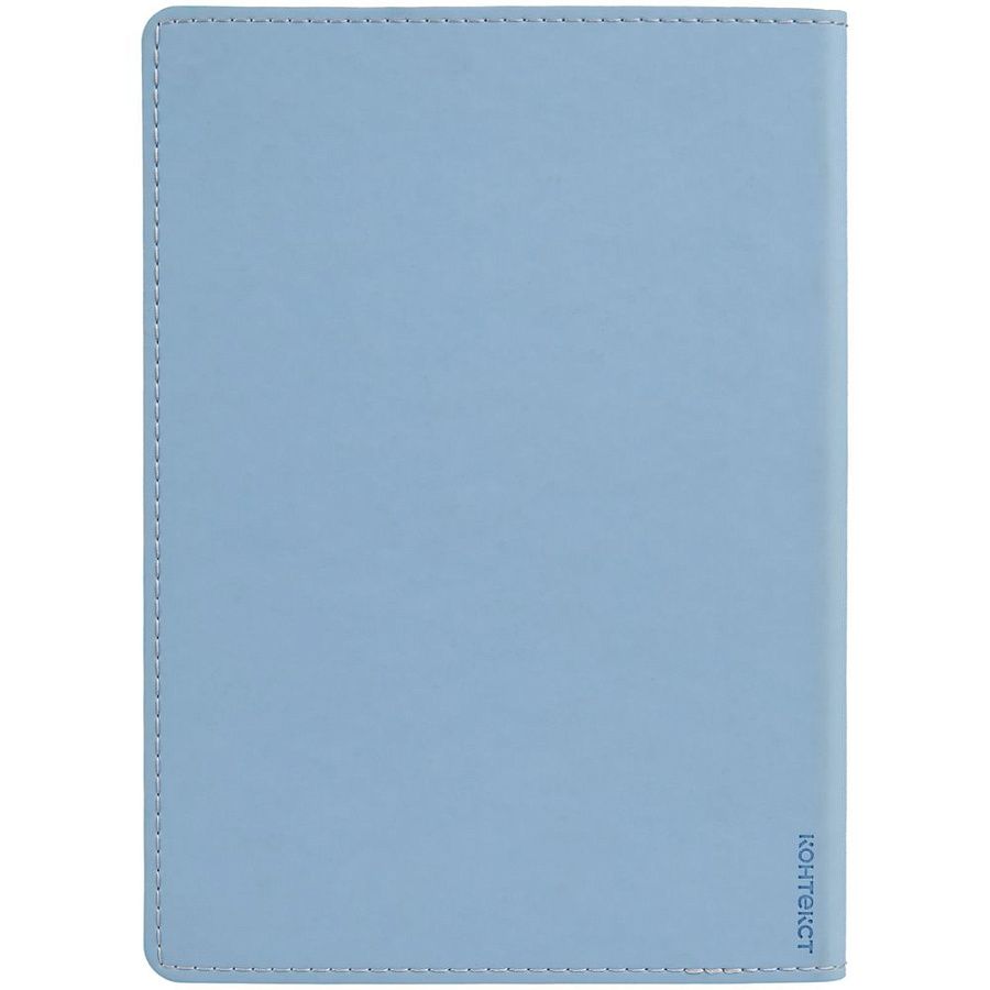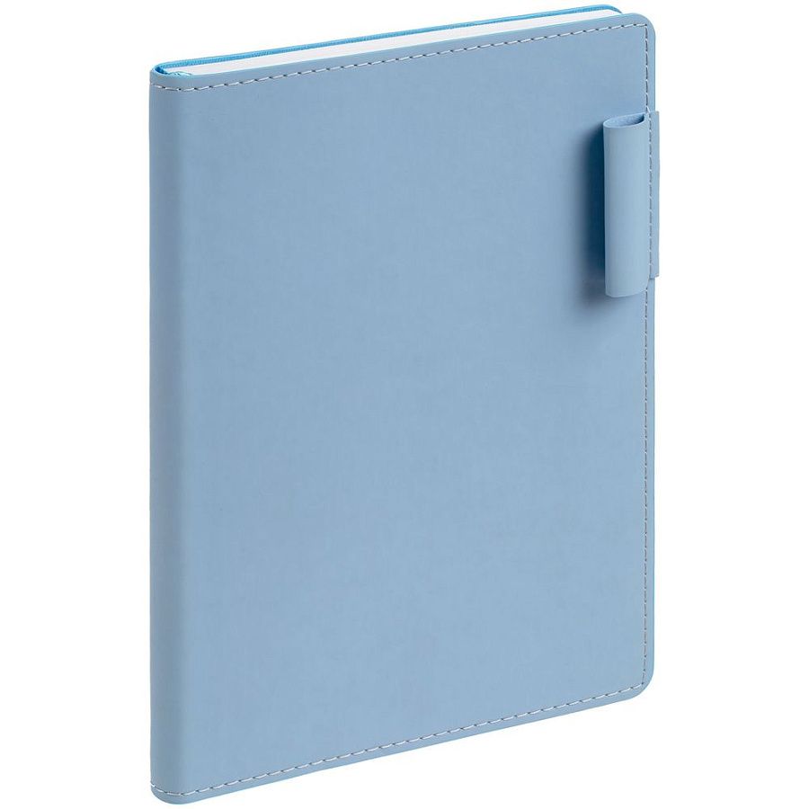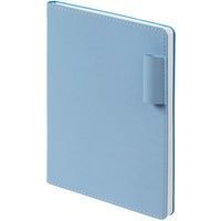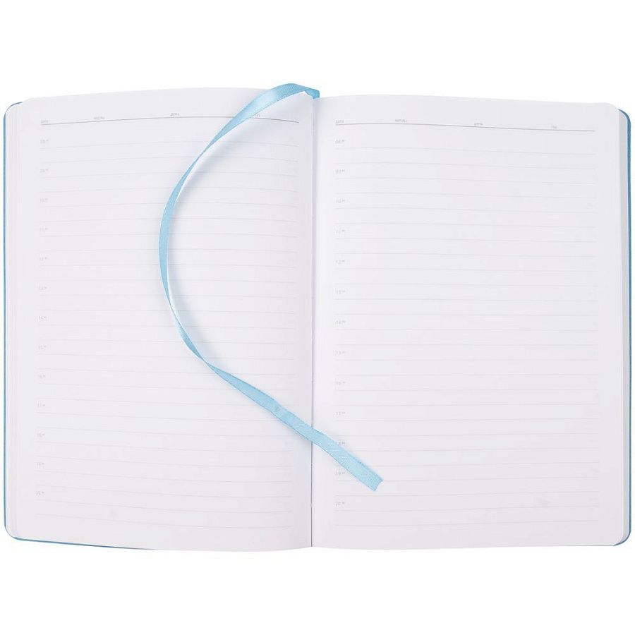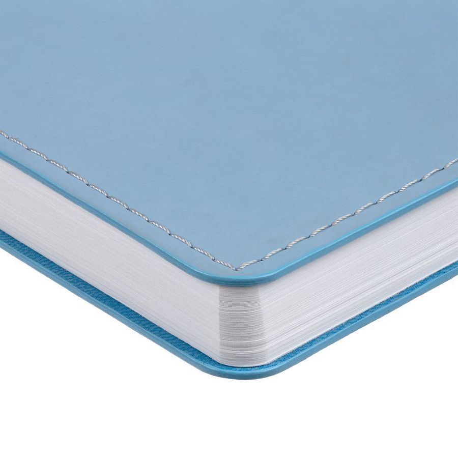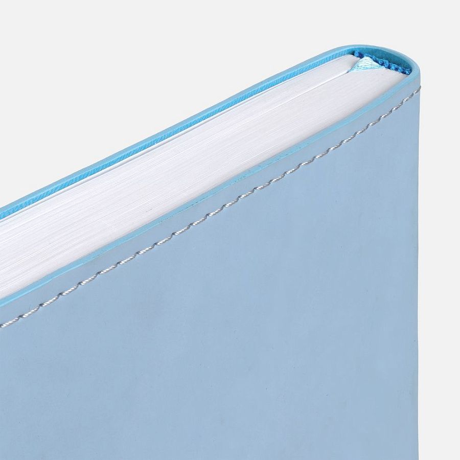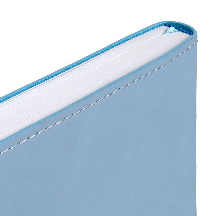 Ежедневник с гибкой обложкой из материала Soft Touch, голубой и Latte, голубой (внутренний материал), дополнен петелькой для ручки из покровного материала, капталом, ляссе и закрашенным срезом обложки в цвет материала.