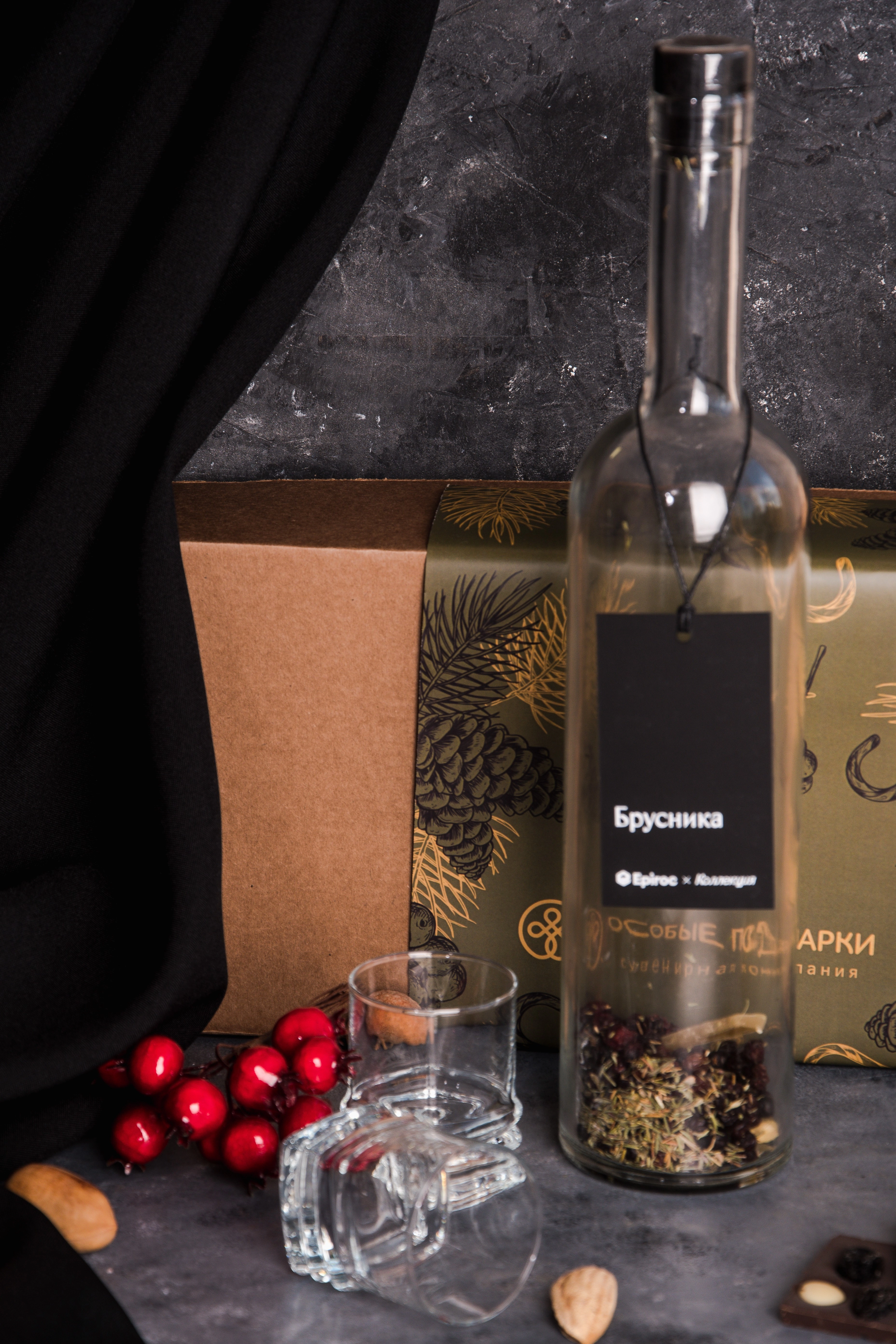 Набор для приготовления и наслаждения ароматной зимней настойкой. Ингредиенты для неё поставляются в эффектной стеклянной бутылке. Дополняется она стопками и ломаным шоколадом с лесными ягодами.