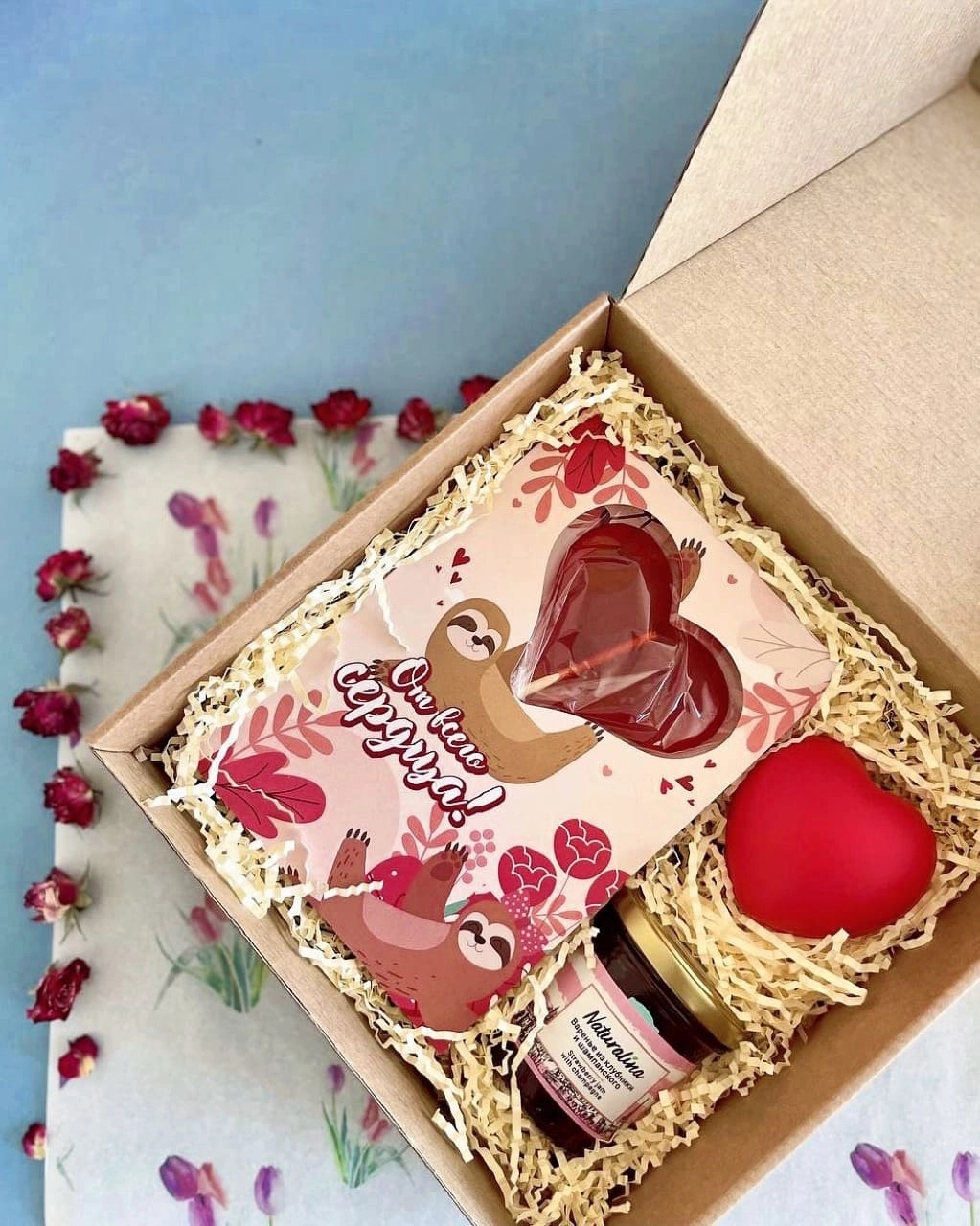 Антистрессовое сердце для умиротворения, варенье из клубники и шампанского для сладкого удовольствия и открытка с леденцом для исполнения желаний. Всё упаковано в красивую подарочную коробку с наполнителем. Подарок для тех, кому нужно немного любви и заботы в жизни.