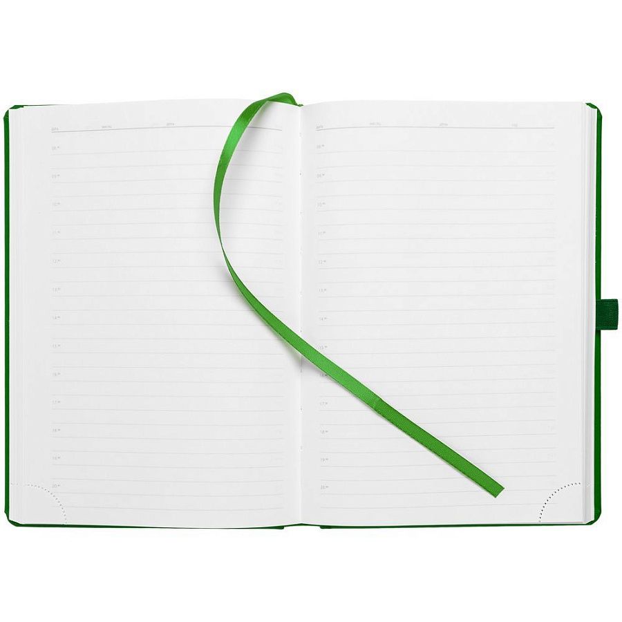 Ежедневник с твердой обложкой без поролона, выполнен из материала Soft Touch Ultra, зеленый FF, дополнен резинкой шириной 1 см, петлей-резинкой для ручки, капталом и ляссе ярко-зеленого цвета.