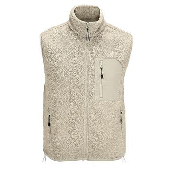 Жилет унисекс из искусственного меха шерпа с карманами на молнии: 1 нагрудным из таслана для нанесения логотипа и 2 боковыми. Черные пуллеры на молниях со светоотражающими элементами. Слегка удлиненная спинка. Эластичный шнурок по низу изделия.