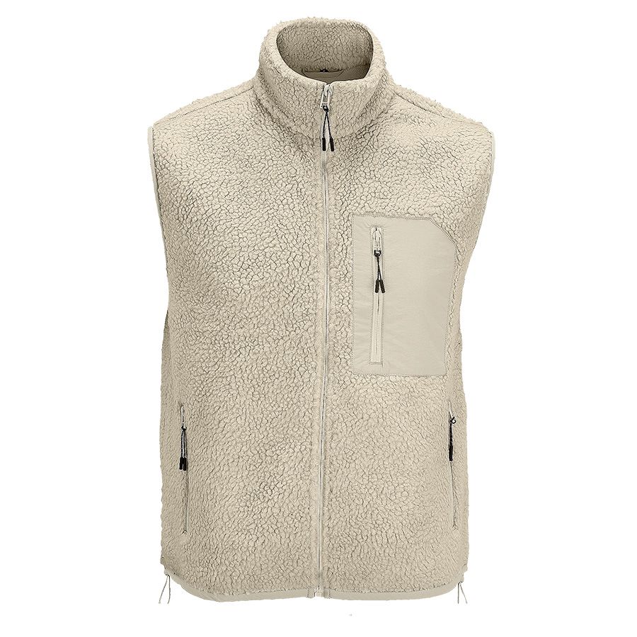 Жилет унисекс из искусственного меха шерпа с карманами на молнии: 1 нагрудным из таслана для нанесения логотипа и 2 боковыми. Черные пуллеры на молниях со светоотражающими элементами. Слегка удлиненная спинка. Эластичный шнурок по низу изделия.