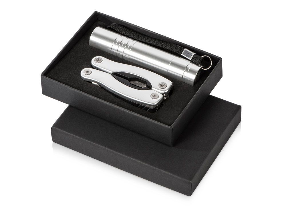 Подарочный набор Scout с многофункциональным ножом и фонариком. 11-тифункциональный инструмент с диодным фонариком упакован в черную картонную коробку. Батарейка в комплекте. Алюминий.