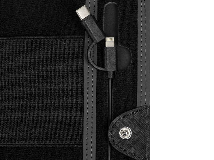 Органайзер закрывается на кнопку, имеет фиксирующие резинки для проводов и других мелочей, а также большой карман, отсек для паспорта и 4 — для карточек. Для проводной зарядки предусмотрен встроенный провод.