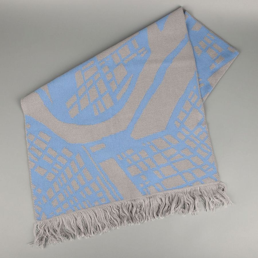 Палантин с пестрой бахромой с вывязанным логотипом и индивидуальным рисунком в фирменной цветовой гамме.