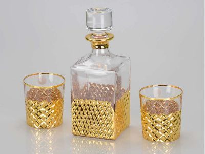Стильный набор для виски из прозрачного хрусталя рассчитан на две персоны. Набор включает в себя графин, пару бокалов и футляр для хранения. Хрустальная поверхность графина и бокалов задекорирована интересным золотистым узором.