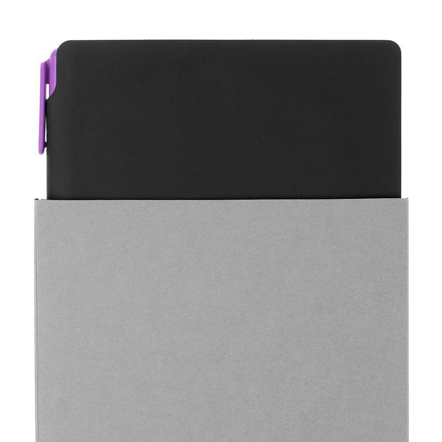 Удобный ежедневник с гибкой обложкой и местом под ручку в корешке, миниатюрная ручка из переработанного пластика и компактная самосборная коробка — простые составляющие полезного делового набора.