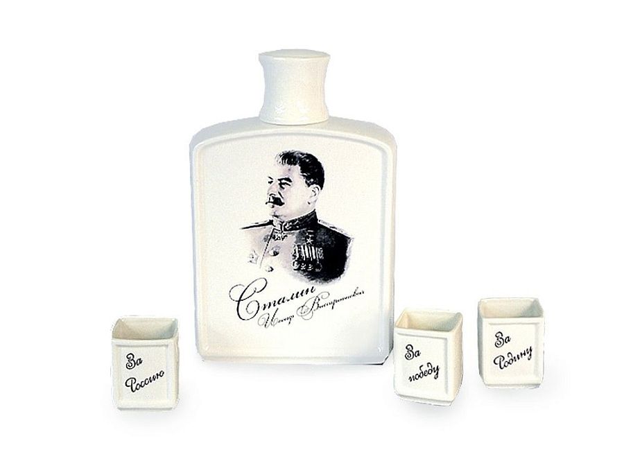 Подарочный набор стилизован под книгу и состоит из штофа с изображением генералиссимуса И. В. Сталина и трех рюмок с патриотическими тостами “За Россию”, “За Родину”, “За победу”. Все сувениры выполнены из высококачественной керамики, поэтому они еще долго будут служить и радовать глаз. Этот подарочный набор станет прекрасным дополнением к праздничному столу.