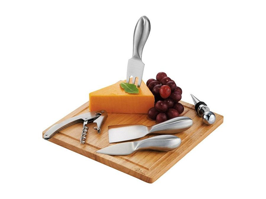 Набор для сыра и вина Mino. В этот набор из 6-ти предметов входит деревянная разделочная доска, три ножа для мягкого сыра, твердого и зрелого сыра, стоппер для вина и штопор. Набор предлагается в деревянной подарочной коробке с шильдом 40 х 25 мм для лого.