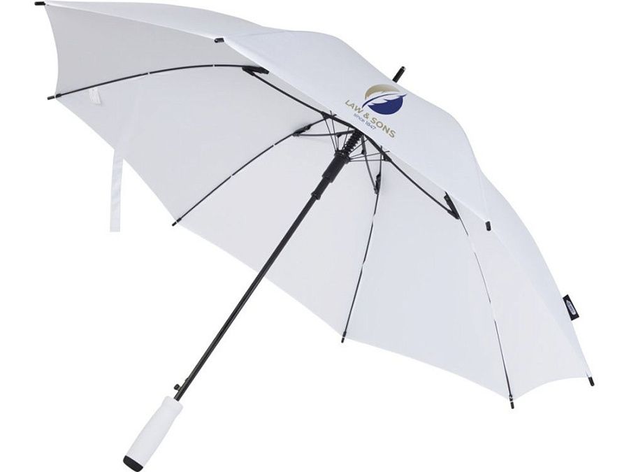 23-дюймовый зонт с куполом из эпонж полиэстера из переработанного ПЭТ-пластика. Автоматическое открытие. Имеет прочный металлический стержень, раму из стекловолокна и удобную ручку из EVA с кончиком черного цвета. Большая зона для печати на каждой панели.