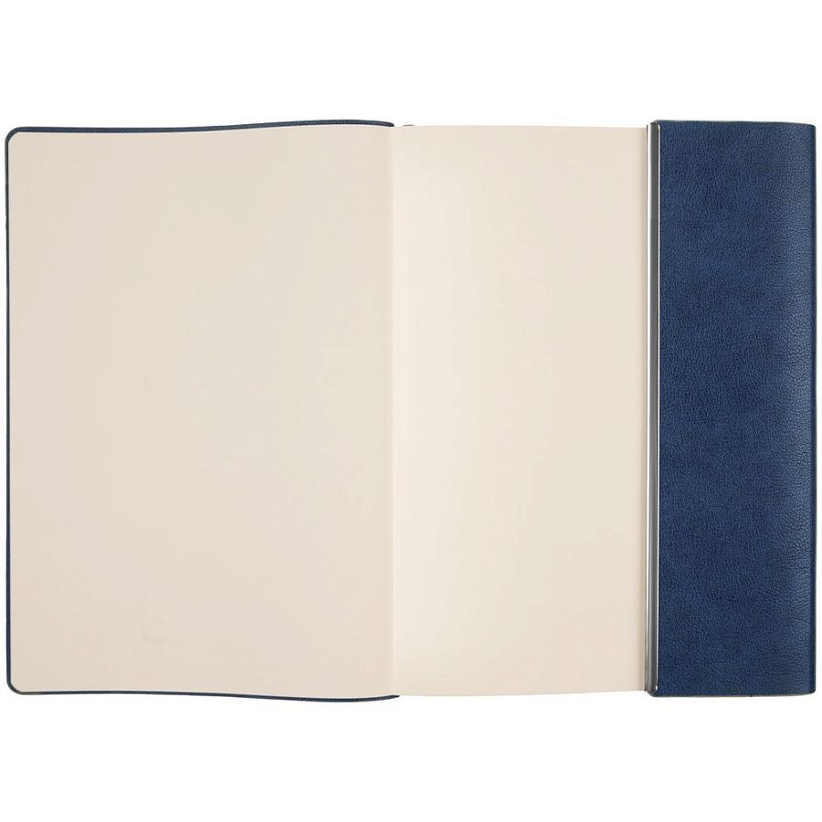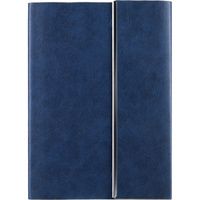 Ежедневник с гибкой обложкой, клапаном на магните и металлической отделкой клапана. Выполнен из материала Petrus, синий НН, дополнен серым ляссе.